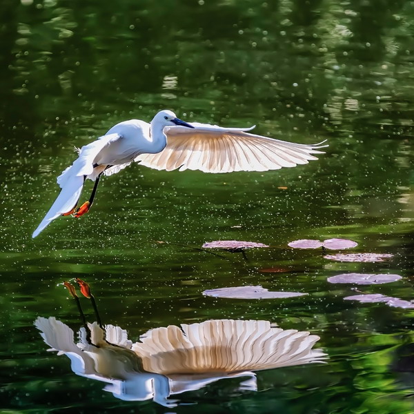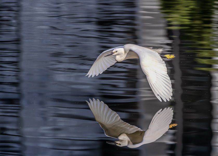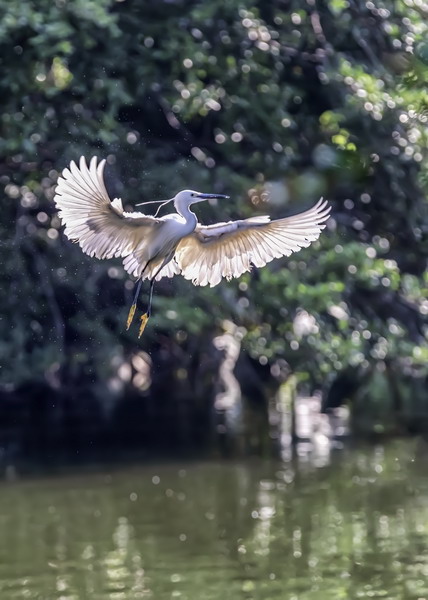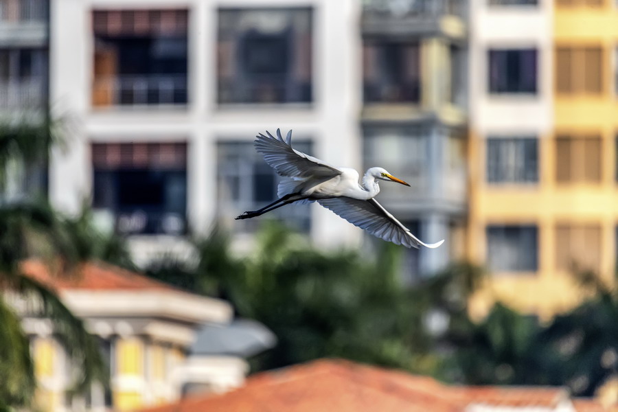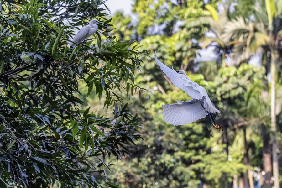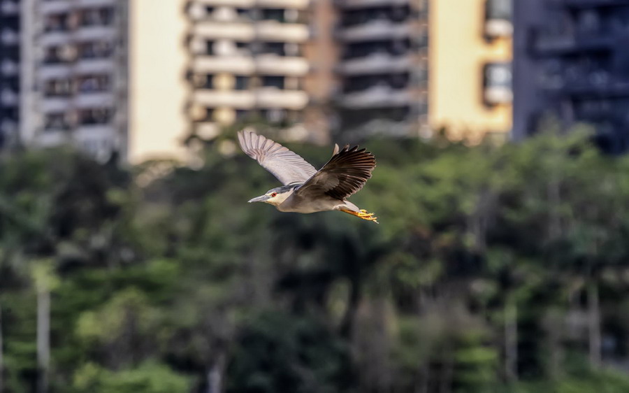4月15日,攝于南山區(qū)華僑城天鵝堡附近。這是深圳拍鷺鳥的其中一個好去處。白鷺飛行時頭往回縮至肩背處,頸向下曲成袋狀,兩腳向后伸直,遠遠突出于尾后,兩翅緩慢地鼓動飛翔。徐捷攝