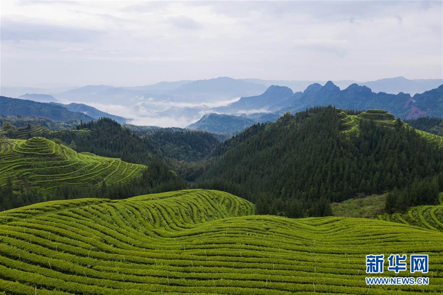 俯瞰鹿鳴茶海一角(4月28日無人機照片)。四川省珙縣的鹿鳴茶海,常年云霧繚繞,茶壟依山分布,美不勝收。新華社記者江宏景攝