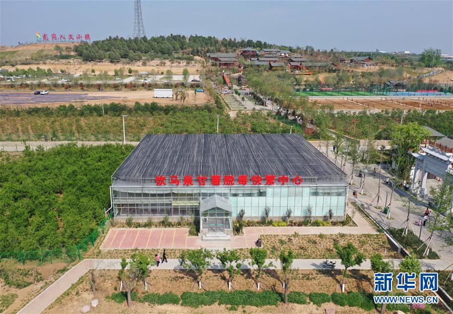 這是5月1日拍攝的河南省鶴壁市淇濱區(qū)鉅橋鎮(zhèn)崗坡村飲馬泉甘薯脫毒快繁中心(無人機照片)。 新華社記者馮大鵬攝