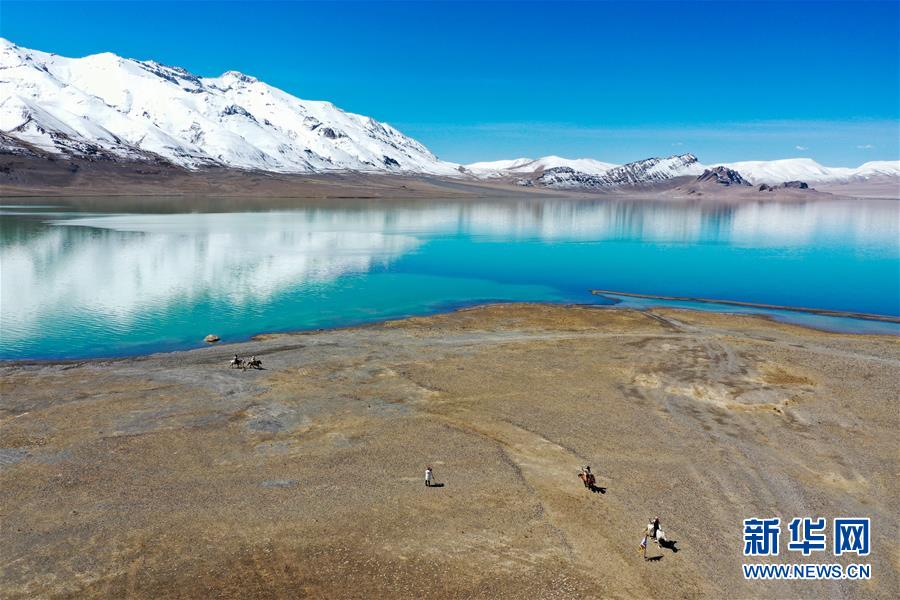 4月30日,牧民在當(dāng)穹錯(cuò)湖畔騎馬(無(wú)人機(jī)照片)。當(dāng)穹錯(cuò)地處西藏那曲市尼瑪縣南部,湖面海拔4475米。暮春時(shí)節(jié),湖水碧藍(lán)清亮,讓人仿佛置身仙境。新華社記者侯捷攝