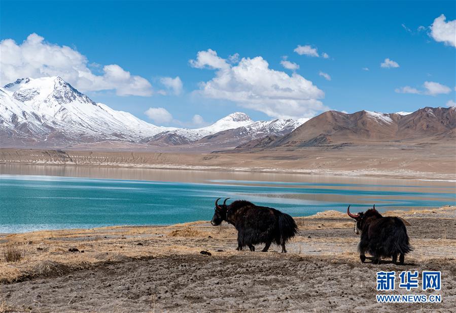 4月30日,兩只牦牛在當(dāng)穹錯(cuò)湖畔。當(dāng)穹錯(cuò)地處西藏那曲市尼瑪縣南部,湖面海拔4475米。暮春時(shí)節(jié),湖水碧藍(lán)清亮,讓人仿佛置身仙境。新華社記者侯捷攝