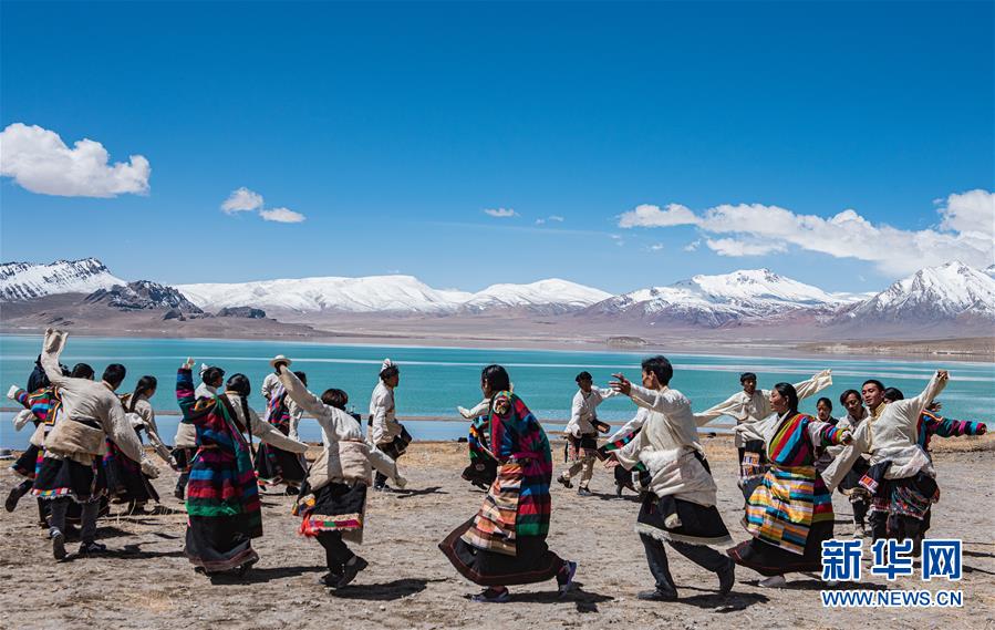 4月30日,牧民在當(dāng)穹錯(cuò)湖畔跳鍋莊舞。當(dāng)穹錯(cuò)地處西藏那曲市尼瑪縣南部,湖面海拔4475米。暮春時(shí)節(jié),湖水碧藍(lán)清亮,讓人仿佛置身仙境。新華社記者侯捷攝