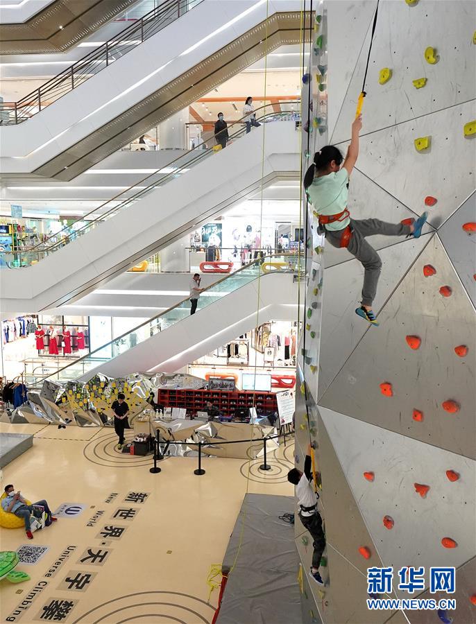 5月2日,小朋友在上海市南京路的一家百貨商場內(nèi)體驗攀巖運動。“五一”假日期間,人們以多種方式放松心情、享受假日。新華社記者陳飛攝