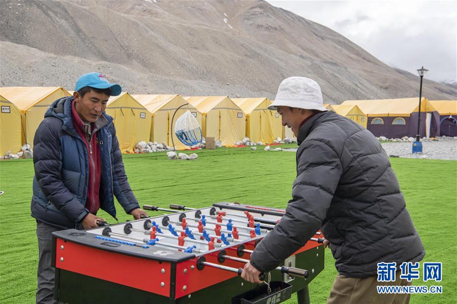 登山隊(duì)員在珠峰大本營(yíng)玩桌上足球(5月1日攝)。新華社記者孫非攝