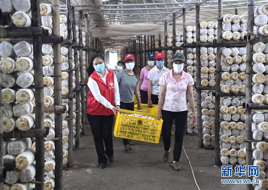 唐莉(左一)在平樂縣張家鎮(zhèn)食用菌生產(chǎn)基地幫工人搬運袖珍菇(5月4日攝)。新華社記者周華攝