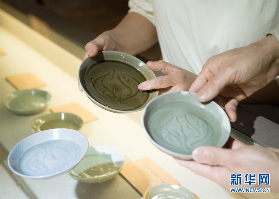 5月8日,“90后”瓷人湯佳(左)將自己制作的魚(yú)紋盤(pán)帶到龍泉青瓷裝飾紋樣研究所,跟項(xiàng)宏金收藏的古瓷器比對(duì)。1965年出生的項(xiàng)宏金,被浙江龍泉年輕一代瓷人稱(chēng)為“項(xiàng)哥”,他從20世紀(jì)90年代開(kāi)始收集龍泉青瓷標(biāo)本,研究青瓷紋樣。2014年出版著作《龍泉青瓷裝飾紋樣》,次年開(kāi)設(shè)龍泉青瓷裝飾紋樣研究所,將自己收藏的千余件標(biāo)本跟瓷器愛(ài)好者、創(chuàng)作者免費(fèi)分享。新華社記者翁忻旸攝