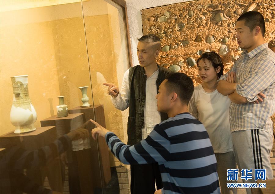5月8日,項(xiàng)宏金(左一)在龍泉青瓷裝飾紋樣研究所向來(lái)訪(fǎng)的年輕瓷人介紹一件貫耳瓶。1965年出生的項(xiàng)宏金,被浙江龍泉年輕一代瓷人稱(chēng)為“項(xiàng)哥”,他從20世紀(jì)90年代開(kāi)始收集龍泉青瓷標(biāo)本,研究青瓷紋樣。2014年出版著作《龍泉青瓷裝飾紋樣》,次年開(kāi)設(shè)龍泉青瓷裝飾紋樣研究所,將自己收藏的千余件標(biāo)本跟瓷器愛(ài)好者、創(chuàng)作者免費(fèi)分享。新華社記者翁忻旸攝