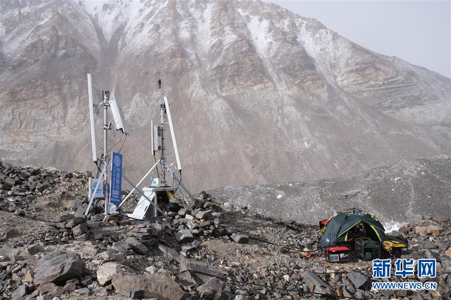 過渡營地附近的中國移動基站(5月8日攝)。珠峰過渡營地海拔5800米,是連接前進(jìn)營地和珠峰大本營的重要一站。登山愛好者從大本營徒步大約四個小時就能抵達(dá)過渡營地。此段路程亂石林立,同時也能欣賞壯美的冰川。新華社記者孫非攝