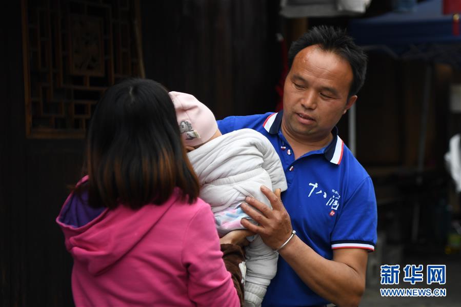 施六金(右)從妻子手中接過兒子施澤恩(4月25日攝)。1973年出生于十八洞村的施六金,由于父親患病很早就放棄學業(yè)和母親扛起了家庭的重擔。為了生活,他還曾遠去東南亞打工。2015年,看到家鄉(xiāng)的變化,施六金回到村里開起了農家樂,年度家庭人均純收入也從2014年的1715元增長到了2019年的35696元。2018年,施六金與心愛的人組建了家庭。今年初,施六金與愛人迎來了一個大胖小子。“做人做事要懂得回報和感恩。”施六金給剛出生的兒子取名施澤恩。新華社記者薛宇舸攝