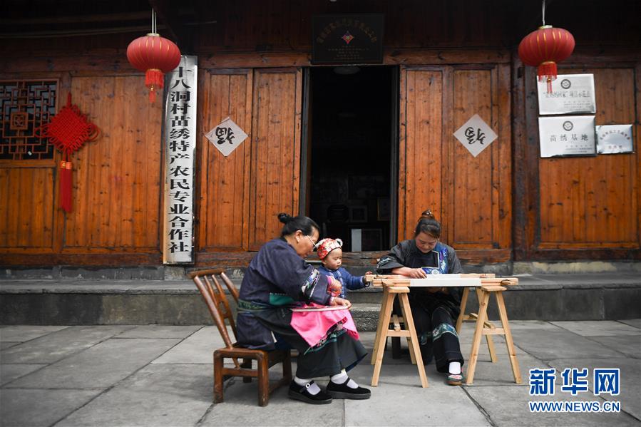 吳美金(右)在十八洞村苗繡特產農民專業(yè)合作社繡苗繡(4月24日攝)。1967年出生的吳美金,1992年嫁入飛蟲村(現十八洞村飛蟲寨)時,只有爛泥路的飛蟲村不僅田土少,掙錢活路也少,生活十分困難。2014年,吳美金加入了十八洞村苗繡特產農民專業(yè)合作社,從小就會的苗繡傳統手藝如今成了家庭增收的法寶,不僅在家門口就把錢掙了,同時還能照顧年幼的孫子孫女?!艾F在的日子,比年輕的時候好多了?!眳敲澜鹫f。新華社記者薛宇舸攝