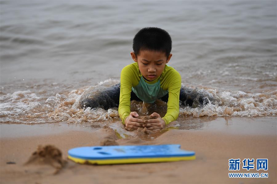5月10日,小朋友在??谖餍愫┩嫠?。近日,海口持續(xù)高溫,不少市民前往海灘戲水消暑。新華社記者蒲曉旭攝