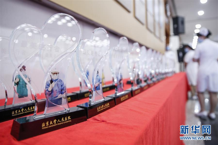 5月11日,工作人員整理印有援鄂隊員工作照的獎杯。在國際護(hù)士節(jié)到來之際,北京大學(xué)人民醫(yī)院11日舉辦慶祝護(hù)士節(jié)暨優(yōu)秀集體和個人表彰活動,并邀請援鄂醫(yī)療隊護(hù)士代表分享戰(zhàn)“疫”故事。我國今年護(hù)士節(jié)的主題為“致敬護(hù)士隊伍,攜手戰(zhàn)勝疫情”。新華社記者張玉薇攝