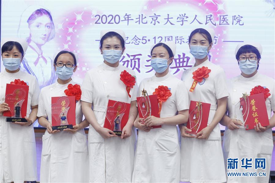 5月11日,獲獎護士在護士節(jié)活動上手捧獎杯和證書。在國際護士節(jié)到來之際,北京大學(xué)人民醫(yī)院11日舉辦慶祝護士節(jié)暨優(yōu)秀集體和個人表彰活動,并邀請援鄂醫(yī)療隊護士代表分享戰(zhàn)“疫”故事。我國今年護士節(jié)的主題為“致敬護士隊伍,攜手戰(zhàn)勝疫情”。新華社記者張玉薇攝