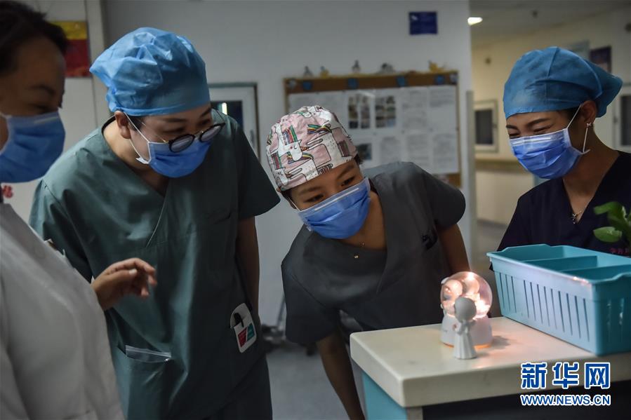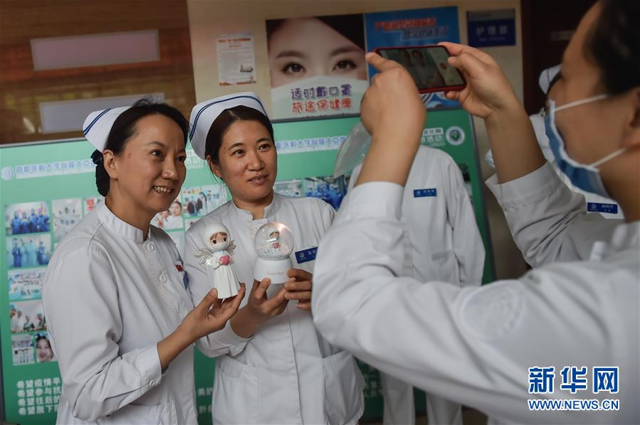 5月11日,在北京地壇醫(yī)院感染二科護(hù)士站,護(hù)士們被在護(hù)士節(jié)收到的禮物——天使玩偶所吸引。北京地壇醫(yī)院是北京市收治新冠肺炎患者的定點醫(yī)院之一,醫(yī)院的醫(yī)護(hù)人員一直奮戰(zhàn)在抗擊疫情的一線。在國際護(hù)士節(jié)前夕,記者前往北京地壇醫(yī)院,記錄下抗疫一線護(hù)士的日常工作狀態(tài)。新華社記者彭子洋攝