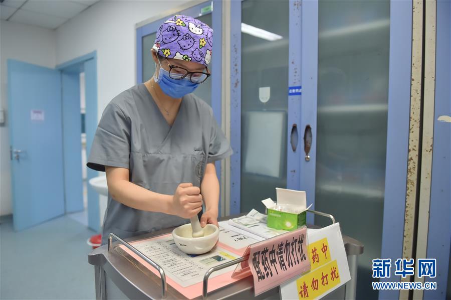 5月11日,在北京地壇醫(yī)院感染二科護(hù)士站,護(hù)士王蕊為不方便服藥的病人研磨藥片。北京地壇醫(yī)院是北京市收治新冠肺炎患者的定點醫(yī)院之一,醫(yī)院的醫(yī)護(hù)人員一直奮戰(zhàn)在抗擊疫情的一線。在國際護(hù)士節(jié)前夕,記者前往北京地壇醫(yī)院,記錄下抗疫一線護(hù)士的日常工作狀態(tài)。新華社記者彭子洋攝