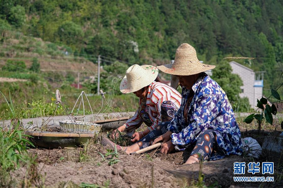 5月12日,青田縣巨浦鄉(xiāng)西坑村的村民在梯田收獲中藥貝母。當?shù)夭扇『献魃缂懈N,冬春種中藥、夏秋種養(yǎng)水稻和田魚的方式,全面提升土地利用率和收益。新華社記者徐昱攝
