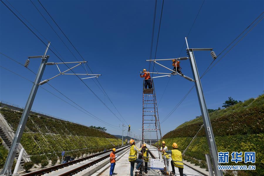5月12日,中國鐵路上海局集團(tuán)公司上海高鐵維修段的技術(shù)人員在商合杭高鐵浙江湖州段調(diào)整接觸網(wǎng)導(dǎo)線。近日,商合杭高鐵合肥至湖州段聯(lián)調(diào)聯(lián)試正有條不紊進(jìn)行中。中國鐵路上海局集團(tuán)公司上海高鐵維修段抽調(diào)49名精兵強(qiáng)將,持續(xù)對管轄范圍內(nèi)的高鐵線路、信號、接觸網(wǎng)線進(jìn)行調(diào)試,為下一階段打下基礎(chǔ)。據(jù)了解,商合杭高鐵合湖段聯(lián)調(diào)聯(lián)試之后將轉(zhuǎn)入運(yùn)行試驗(yàn)階段,驗(yàn)收合格并通過安全評估后,力爭6月底具備開通運(yùn)營條件。新華社記者黃宗治攝