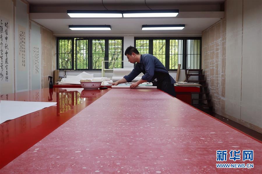 5月13日,古籍修復師在對書畫作品進行裝裱操作。天一閣藏品修復部目前有修復師14人,每年約修復古籍14000余頁。據介紹,修復一冊古籍通常需要1至2個月,有的甚至需要1年以上。新華社記者鄭夢雨攝