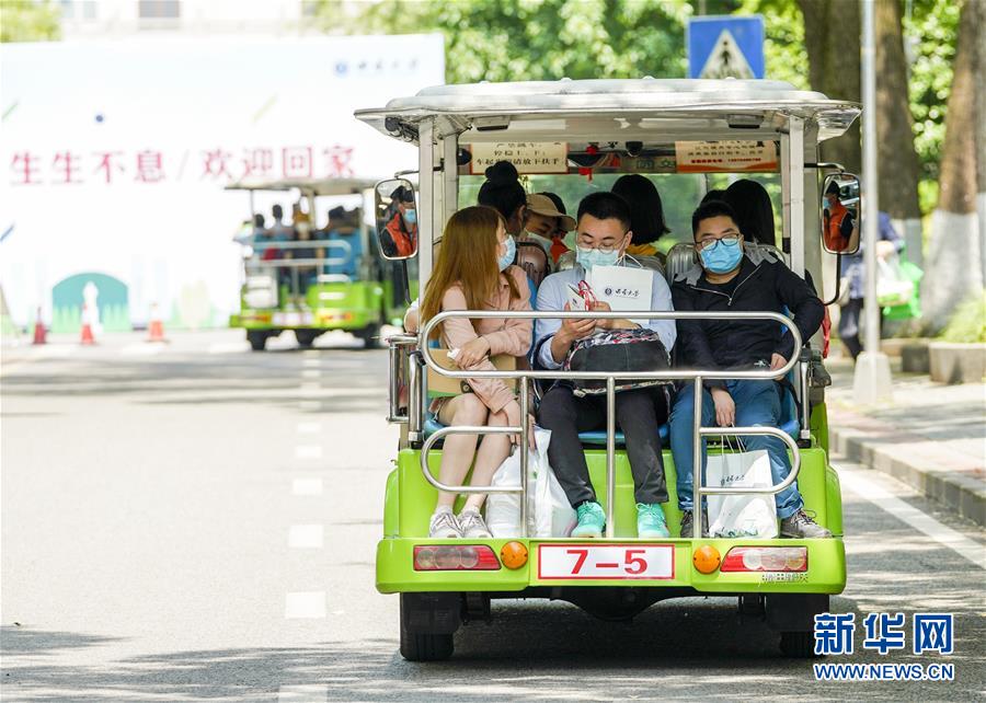 5月15日,在西南大學校園內(nèi),學生們搭乘校內(nèi)轉運車前往各自的宿舍。當日,重慶西南大學迎來疫情以來首批返校大學生。據(jù)介紹,按照疫情防控的需要,重慶市高校2020年春季學期從5月11日起按照“一校一策”原則,實行錯峰錯時分批次有序開學復課。新華社記者劉潺攝