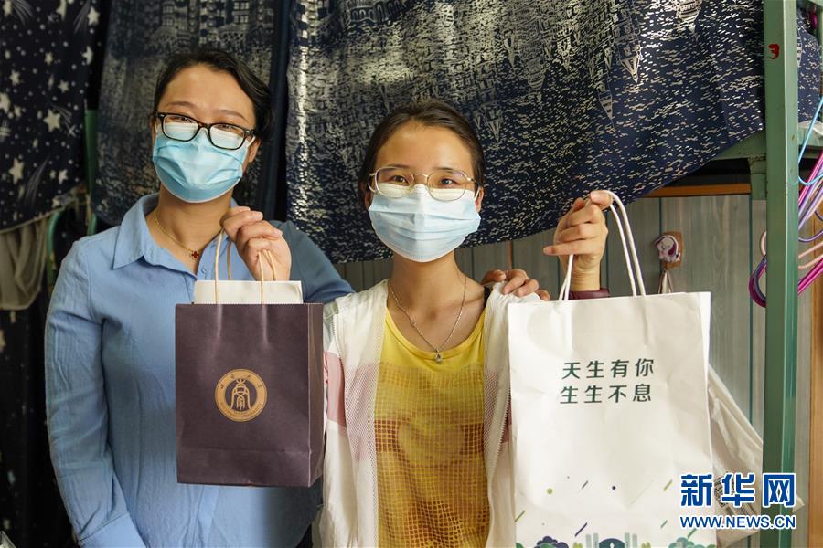 5月15日,在西南大學女生宿舍內(nèi),一名學生(右)展示學校和學院送來的裝有口罩、防疫指南的紙袋。當日,重慶西南大學迎來疫情以來首批返校大學生。據(jù)介紹,按照疫情防控的需要,重慶市高校2020年春季學期從5月11日起按照“一校一策”原則,實行錯峰錯時分批次有序開學復課。新華社記者劉潺攝