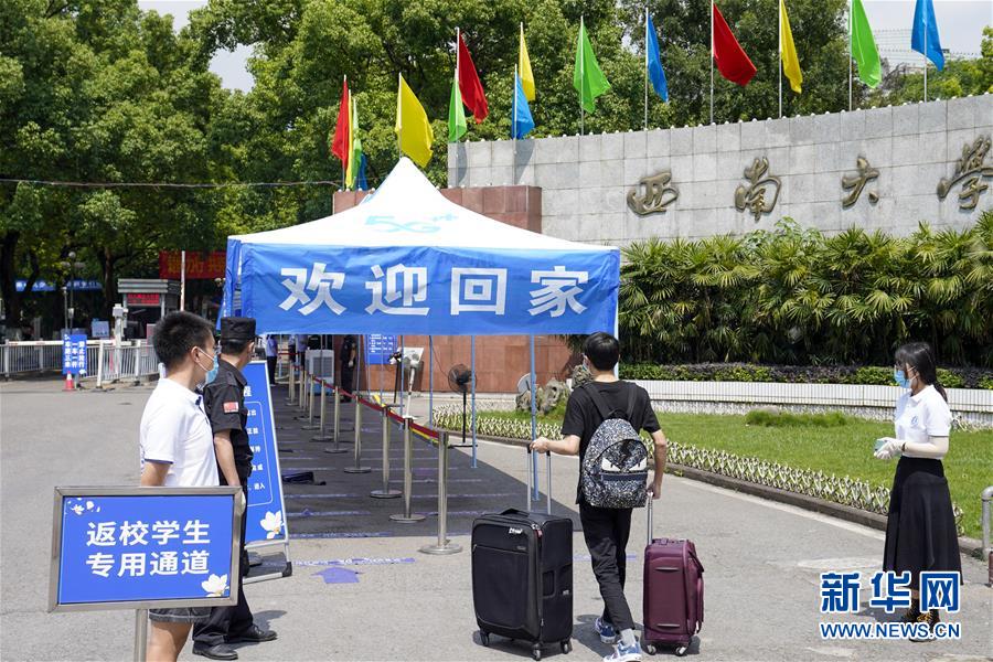 5月15日,在西南大學的返校學生專用通道前,學生按照工作人員和志愿者的引導有序進入校區(qū)。當日,重慶西南大學迎來疫情以來首批返校大學生。據(jù)介紹,按照疫情防控的需要,重慶市高校2020年春季學期從5月11日起按照“一校一策”原則,實行錯峰錯時分批次有序開學復課。新華社記者劉潺攝