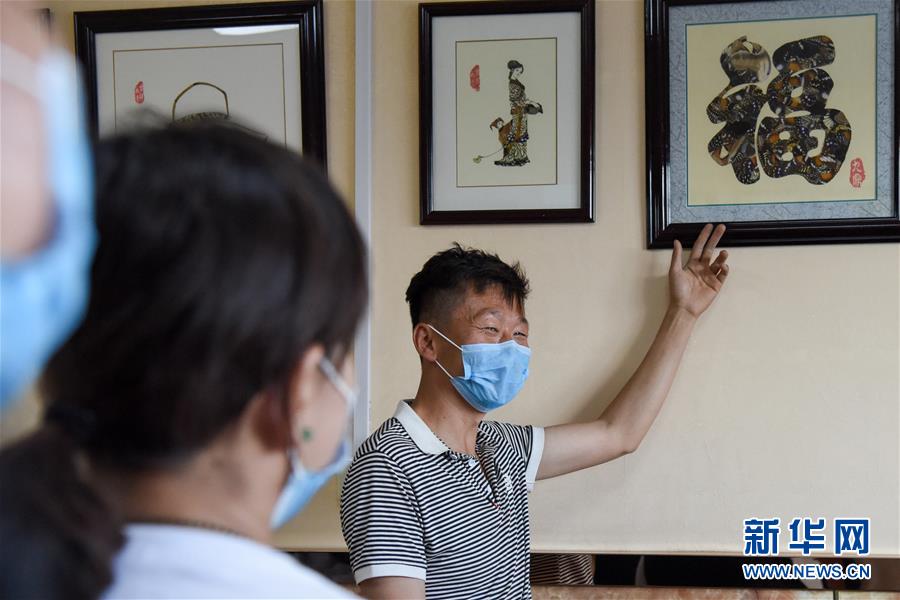 在吉木薩爾縣七彩蝶園,關富云向游客介紹蝶翅畫作品(5月14日攝)。新華社記者丁磊攝
