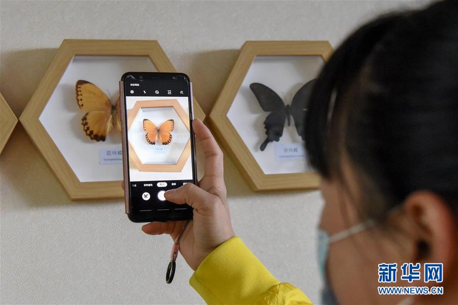在吉木薩爾縣七彩蝶園,游客拍攝蝴蝶標本(5月14日攝)。新華社記者丁磊攝