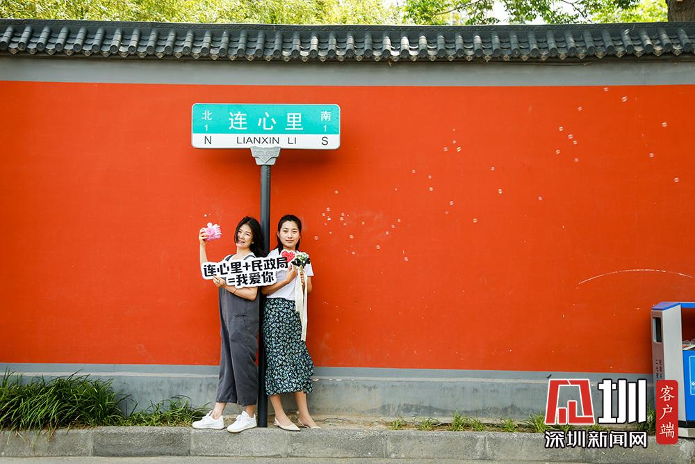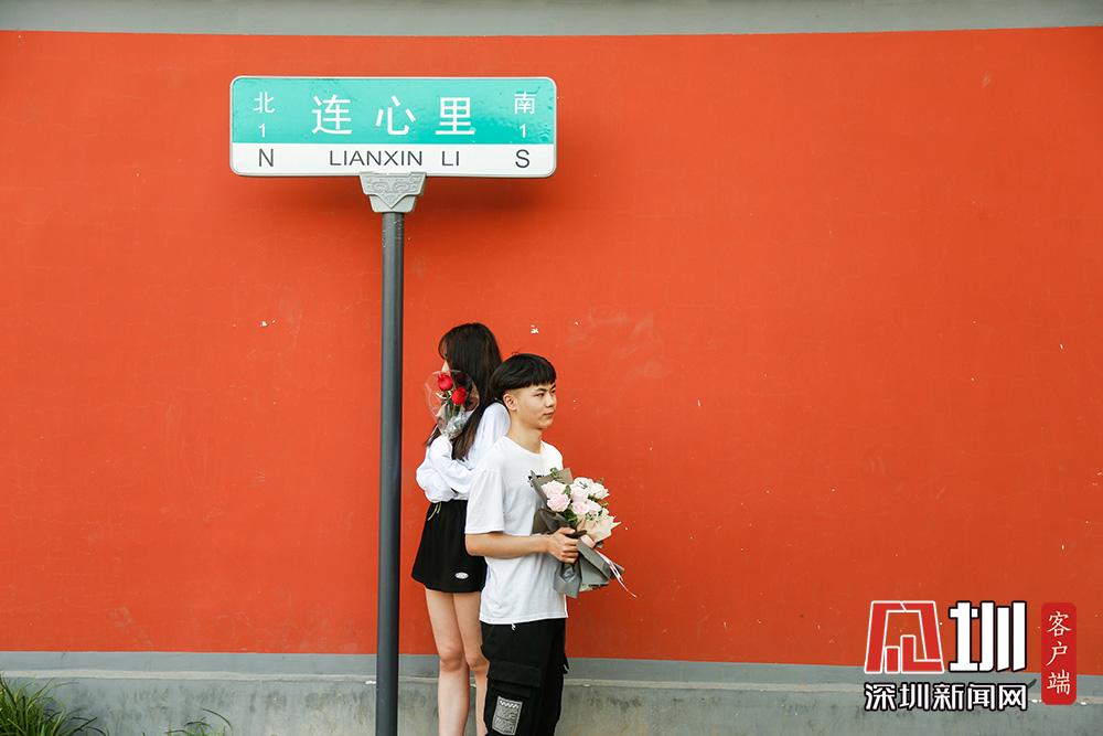 不過,在5月20日當(dāng)天來這里拍照的情侶或夫妻并不多,反倒有眾多“單身狗”與同性閨蜜一起,在“連心里”的路牌下、紅墻邊,手捧鮮花拍照打卡。