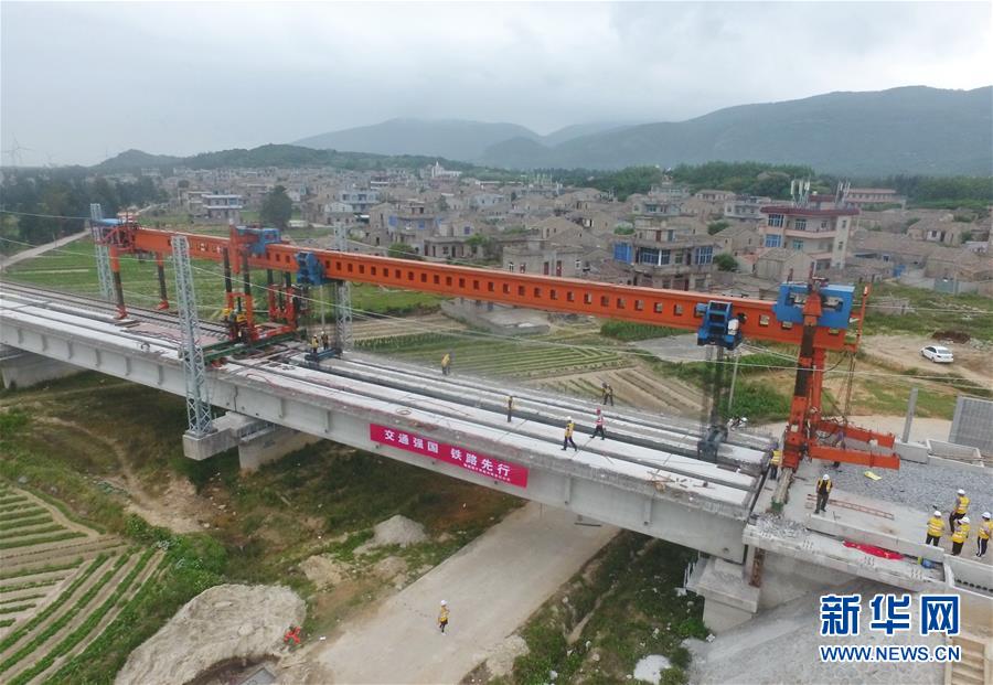 5月20日,福平鐵路洋中特大橋最后一片T型梁成功架設(shè)(無人機(jī)照片)。新華社記者林善傳攝