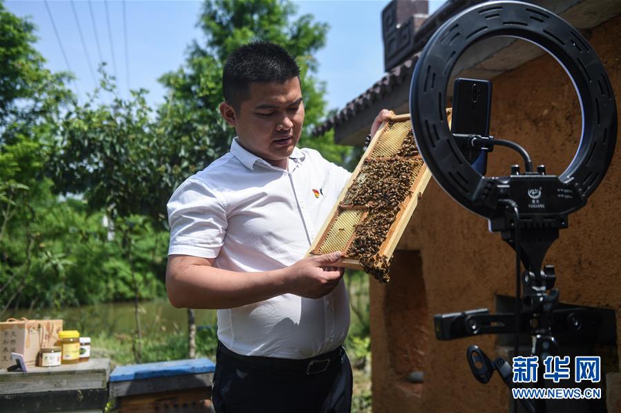 5月20日,長興縣林城鎮(zhèn)畎橋村的意蜂蜂業(yè)幫扶基地內(nèi),養(yǎng)蜂能手邱凱在進行網(wǎng)上直播,介紹當?shù)孛鄯漯B(yǎng)殖特色及相關蜂產(chǎn)品。新華社記者徐昱攝