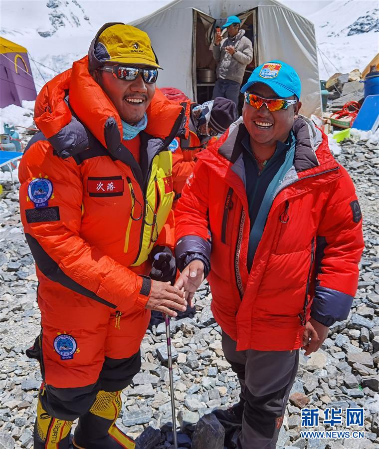 5月24日,2020珠峰高程測量登山隊(duì)副隊(duì)長桑珠(左)和沖頂組組長次落(右)在海拔6500米的前進(jìn)營地。新華社特約記者扎西次仁攝