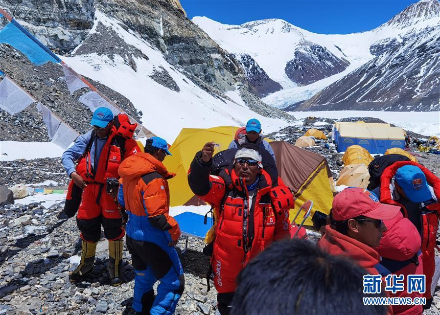 5月24日,2020珠峰高程測量登山隊(duì)部分人員準(zhǔn)備從海拔6500米的前進(jìn)營地出發(fā)。新華社特約記者拉巴攝