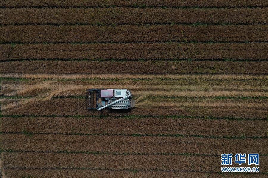 5月24日,農(nóng)戶駕駛收割機(jī)在浙江省湖州市吳興區(qū)八里店鎮(zhèn)尹家圩糧油植保農(nóng)機(jī)專業(yè)合作社的麥田里進(jìn)行收割作業(yè)(無人機(jī)照片)。新華社記者黃宗治攝