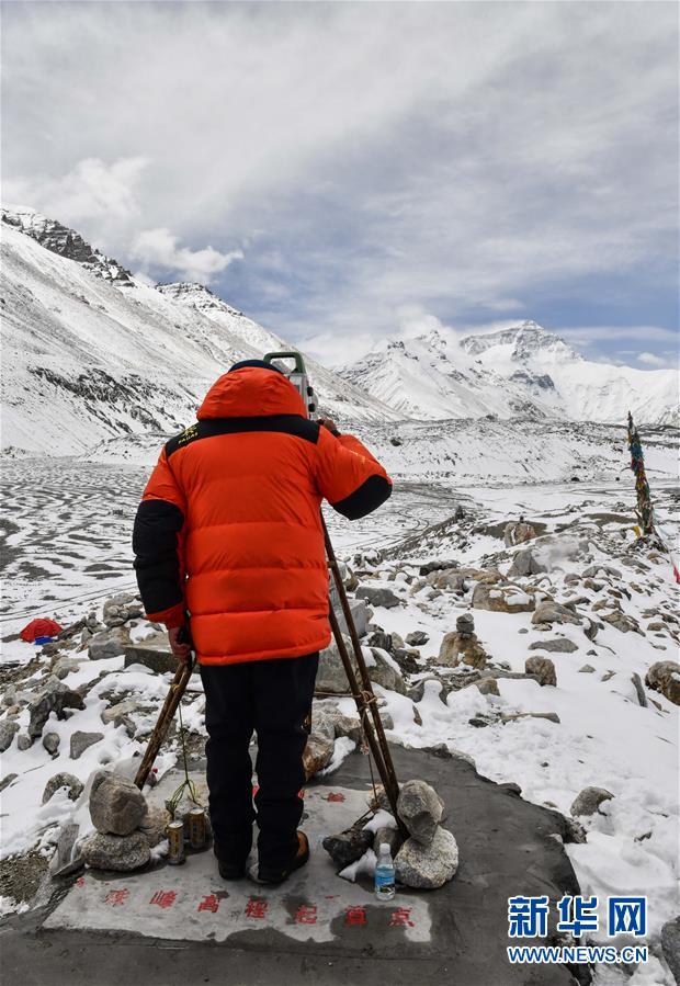 自然資源部第一大地測(cè)量隊(duì)隊(duì)員鄭林在使用全站儀對(duì)珠峰峰頂進(jìn)行交會(huì)觀測(cè)(5月27日攝)。新華社記者普布扎西攝