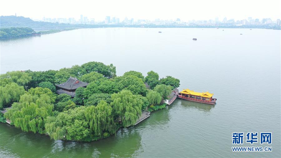 5月27日,船只在西湖湖心亭附近行駛(無(wú)人機(jī)照片)。隨著氣溫升高,杭州西湖綠意蔥蘢,展現(xiàn)出柔美的湖光山色。新華社記者翁忻旸攝