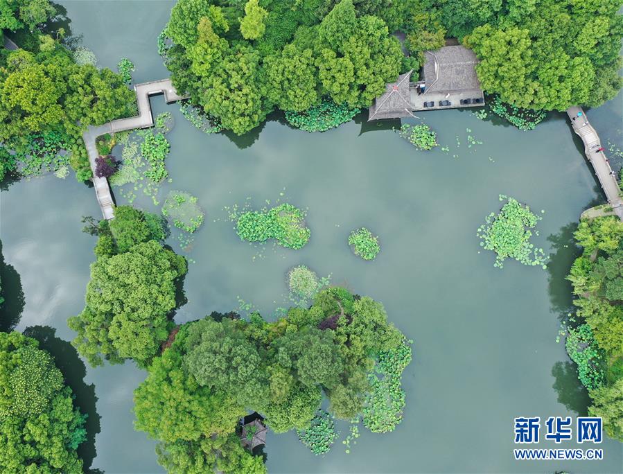 5月27日,游人在西湖曲院風(fēng)荷景區(qū)游覽(無(wú)人機(jī)照片)。隨著氣溫升高,杭州西湖綠意蔥蘢,展現(xiàn)出柔美的湖光山色。新華社記者翁忻旸攝