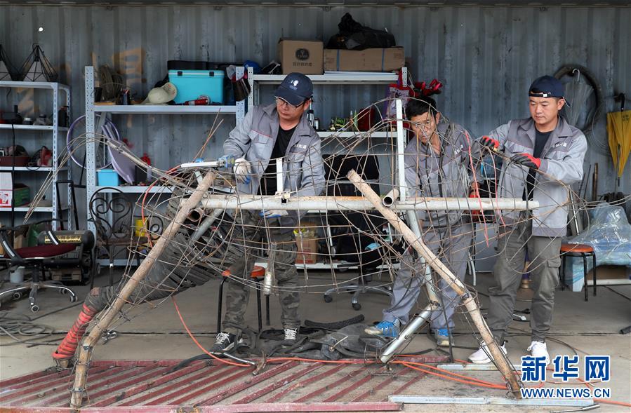5月27日,制作團隊成員郭宇(左)、劉景強(中)和李剛在中轉(zhuǎn)服務站工棚內(nèi)工作。新華社記者方喆攝