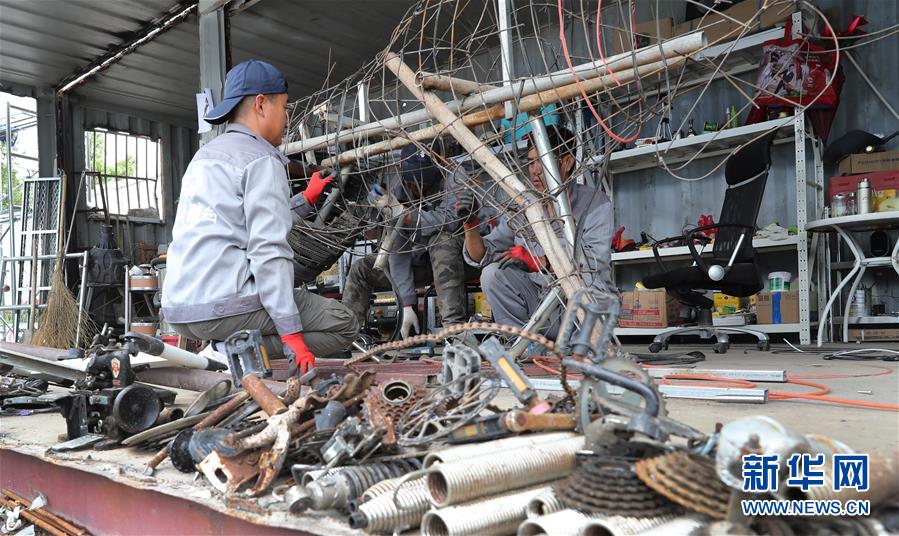 中轉(zhuǎn)服務(wù)站工棚地上堆滿分揀出來準(zhǔn)備制作工藝品的材料(5月27日攝)。新華社記者方喆攝=