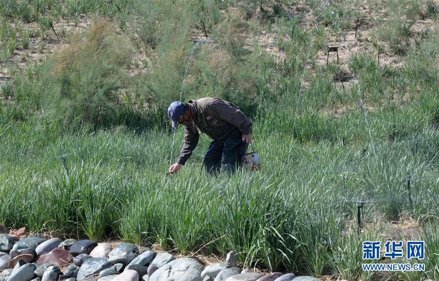 5月28日,工人在巴丹吉林鎮(zhèn)生態(tài)修復(fù)項(xiàng)目南部河道附近修理噴灌設(shè)備,以節(jié)約用水。2017年以來,內(nèi)蒙古阿拉善右旗在巴丹吉林鎮(zhèn)開展生態(tài)修復(fù)項(xiàng)目,種植適合在當(dāng)?shù)厣L的馬蓮、紅柳等植物,修復(fù)生態(tài)的同時也起到美化作用。巴丹吉林鎮(zhèn)是巴丹吉林沙漠旅游景區(qū)的游客集散地,這里常年干旱少雨,水資源匱乏。新華社記者徐欽攝