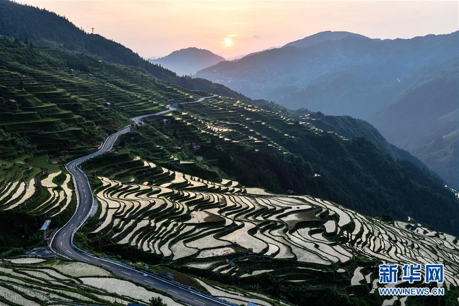 晨光中的從江縣加榜鄉(xiāng)加車梯田(5月28日攝)。夏日時(shí)節(jié),位于貴州省黔東南苗族侗族自治州從江縣加榜鄉(xiāng)加車、加頁(yè)、黨扭等苗寨的梯田在晨霧與陽(yáng)光的映襯下線條分明,光影變幻,景色如畫。新華社記者 楊文斌 攝