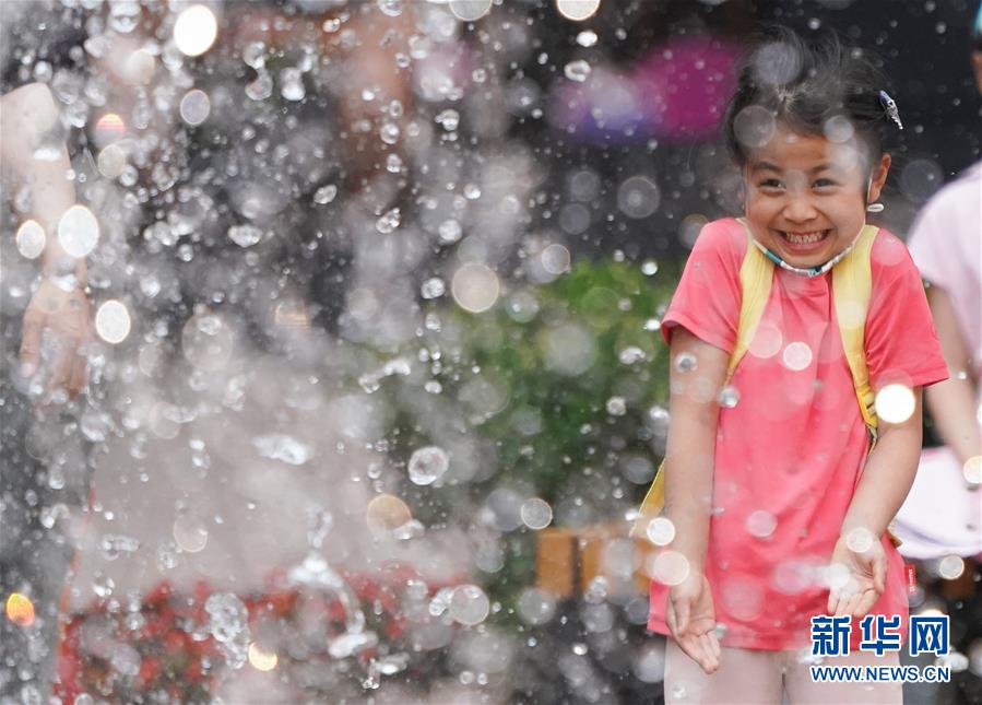 北京王府井步行街,小朋友在噴泉前玩耍(5月29日攝)。新華社記者鞠煥宗攝