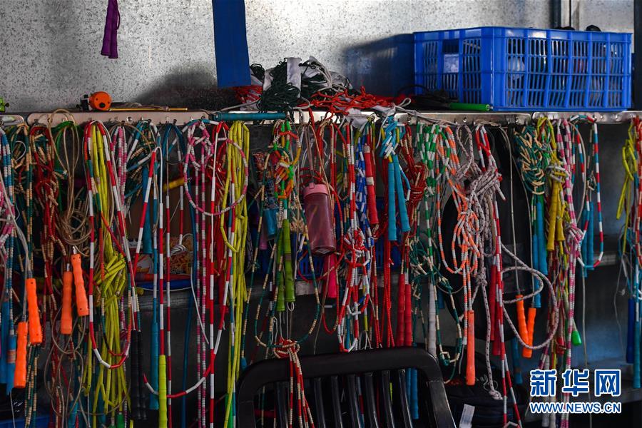 跳繩運動已經(jīng)深深融入七星小學(xué)的日常,器材室里擺放的跳繩(2019年11月18日攝)。新華社記者劉大偉攝