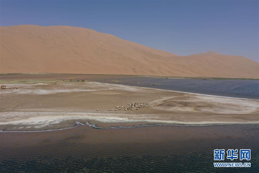 5月31日,羊群在巴丹吉林沙漠音德日?qǐng)D湖湖畔休憩(無人機(jī)照片)。新華社記者徐欽攝。