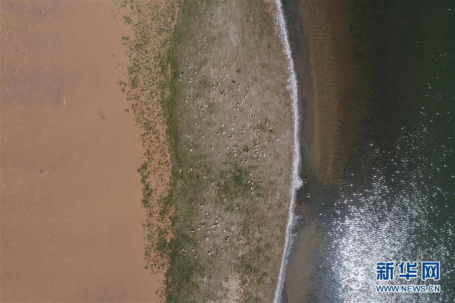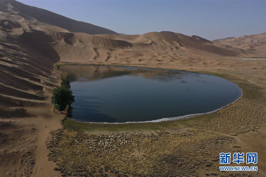 5月30日,羊群在巴丹吉林沙漠一處沙漠湖泊的湖畔休憩(無人機(jī)照片)。新華社記者徐欽攝。
