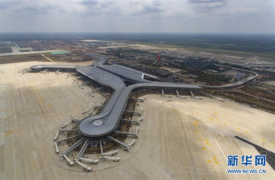這是4月11日拍攝的建設(shè)中的??诿捞m國際機場二期項目航站樓(無人機照片)。新華社記者郭程攝