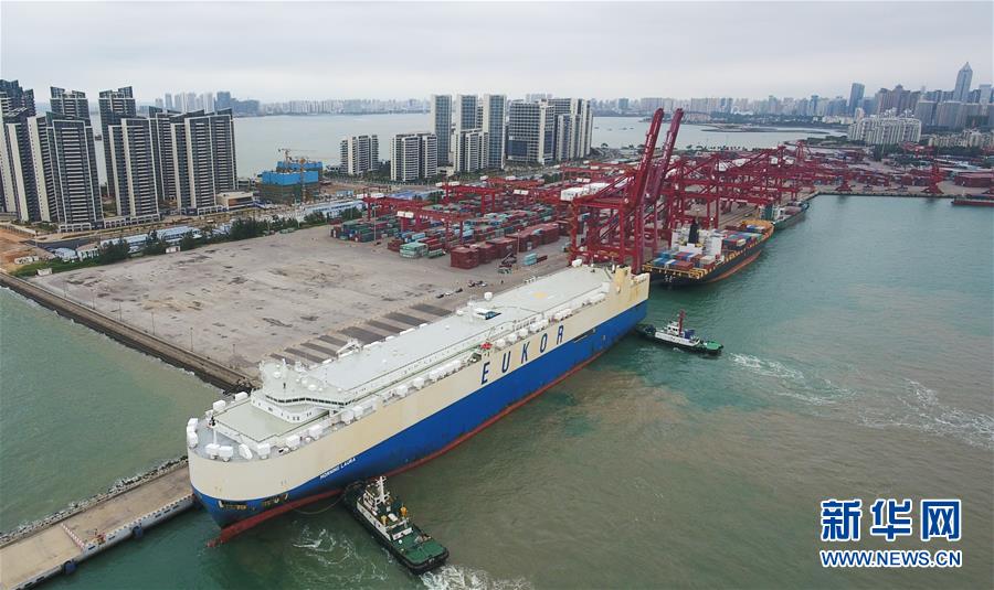 滾裝貨船“勞拉”輪駛?cè)牒?谛阌⒏?,這是海南自貿(mào)區(qū)政策實(shí)施以來的首艘汽車外貿(mào)船(2月16日攝,無人機(jī)照片)。新華社記者楊冠宇攝