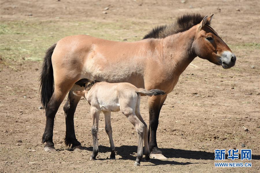 6月2日,在新疆野馬繁殖研究中心,還沒滿月的小馬駒在吃奶。