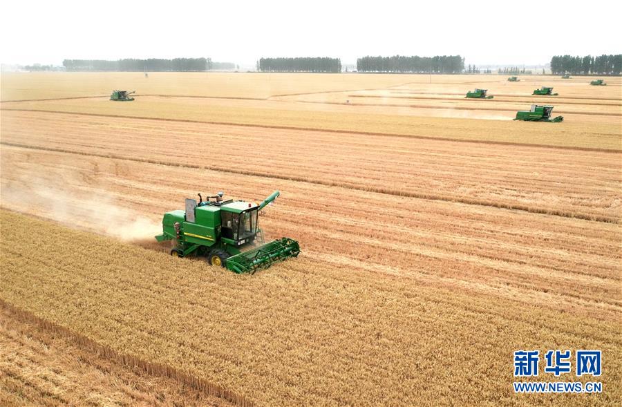 “三夏”時(shí)節(jié),中原大地一片金黃。位于河南省周口市的黃泛區(qū)農(nóng)場(chǎng)機(jī)聲隆隆,10萬(wàn)畝小麥?zhǔn)斋@正酣。