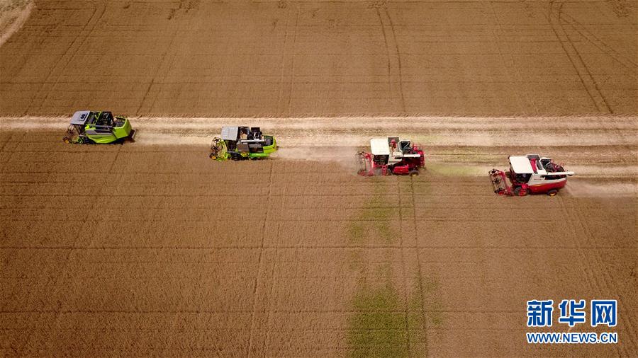 6月3日,在汶上縣郭倉(cāng)鎮(zhèn),收割機(jī)在收獲小麥(無(wú)人機(jī)航拍)。目前,我國(guó)第二大小麥主產(chǎn)區(qū)山東6000多萬(wàn)畝小麥進(jìn)入收獲階段。農(nóng)民們搶抓有利天氣,自南向北陸續(xù)開(kāi)鐮。新華社記者郭緒雷攝。
