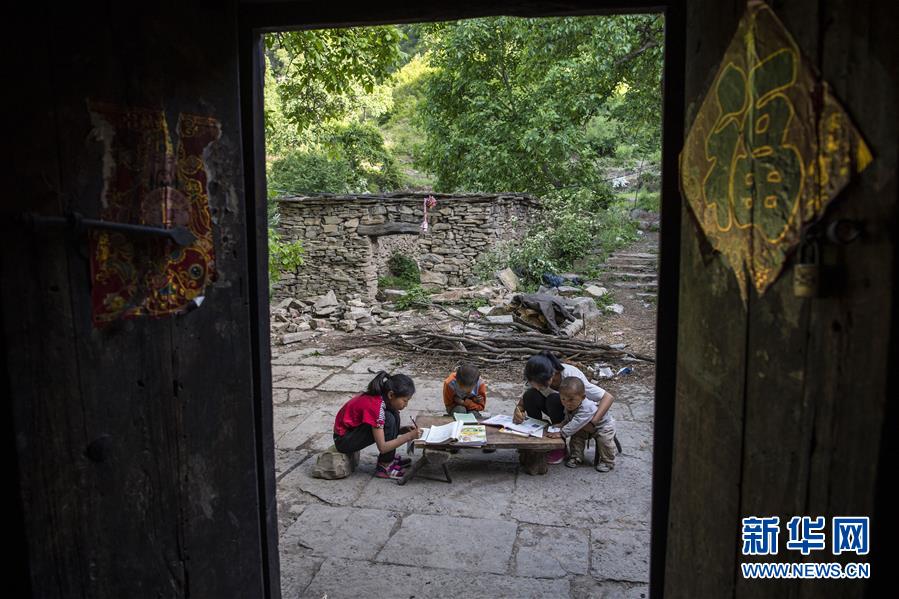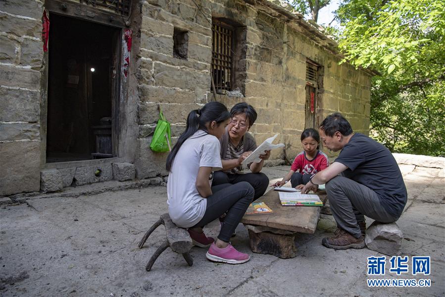 馬武寨寄宿制小學(xué)語文老師崔連瑞(左二)和校長趙金成在南背村三姐弟的家里為孩子們輔導(dǎo)功課(5月31日攝)。新華社記者楊晨光攝。